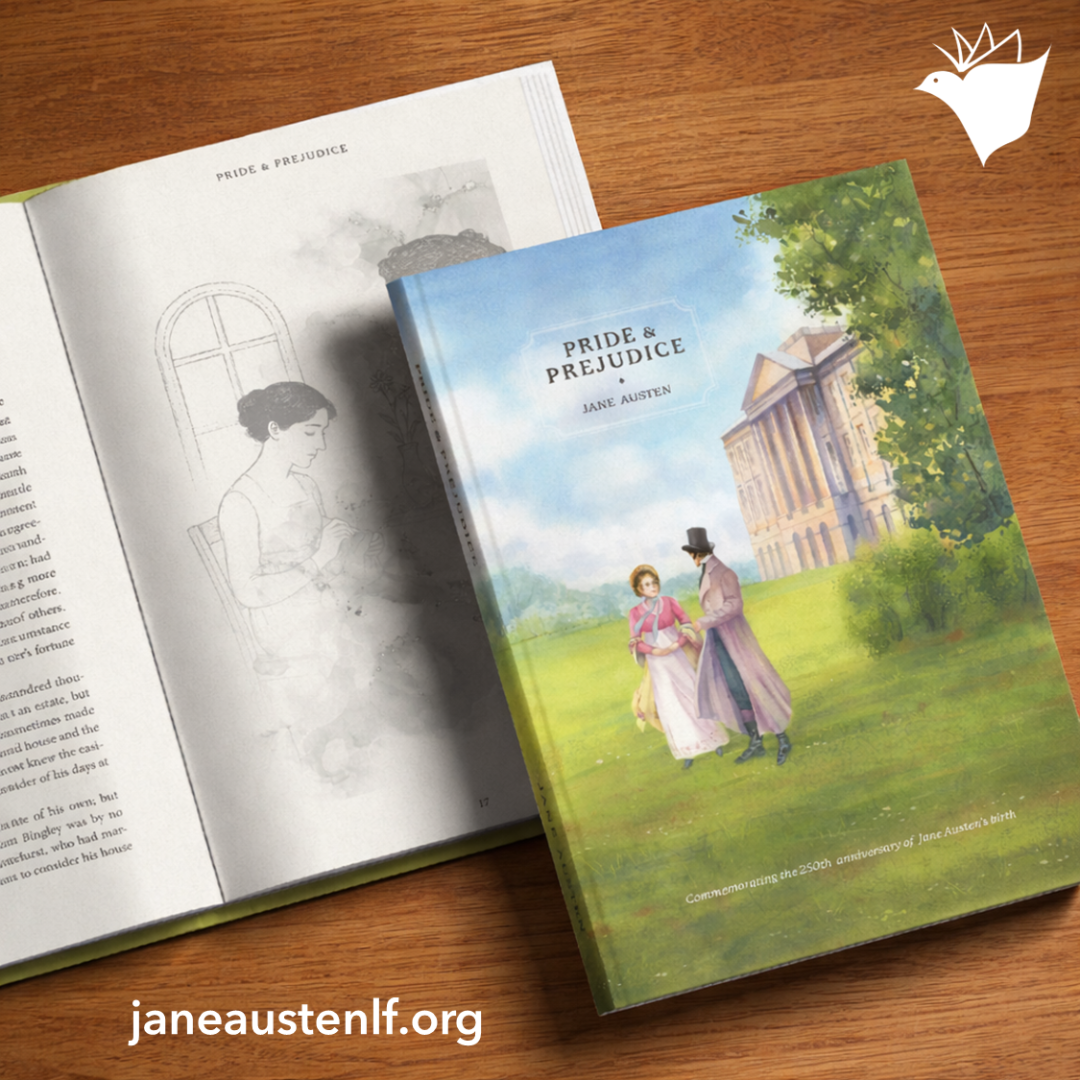 Featuring the beautiful artwork from our commemorative publication of Pride & Prejudice, this bookplate is inspired by a page in long-time volunteer and Foundation Ambassador Julia Grantham's book Mr. Darcy's Guide to Pemberley. Julia worked with artist Lena Tarnovski to create a beautiful new cover for Pride & Prejudice, created especially for our celebration of Jane Austen's 250th birthday.