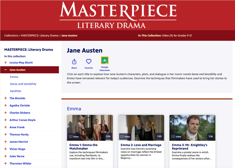 In the MASTERPIECE Literary Drama Collection, you’ll find resources for book-based adaptations ranging from The Diary of Anne Frank to Great Expectations to Jane Eyre. The MASTERPIECE-produced versions of Austen’s Emma, Sense and Sensibility, and Sanditon are also in the Collection.