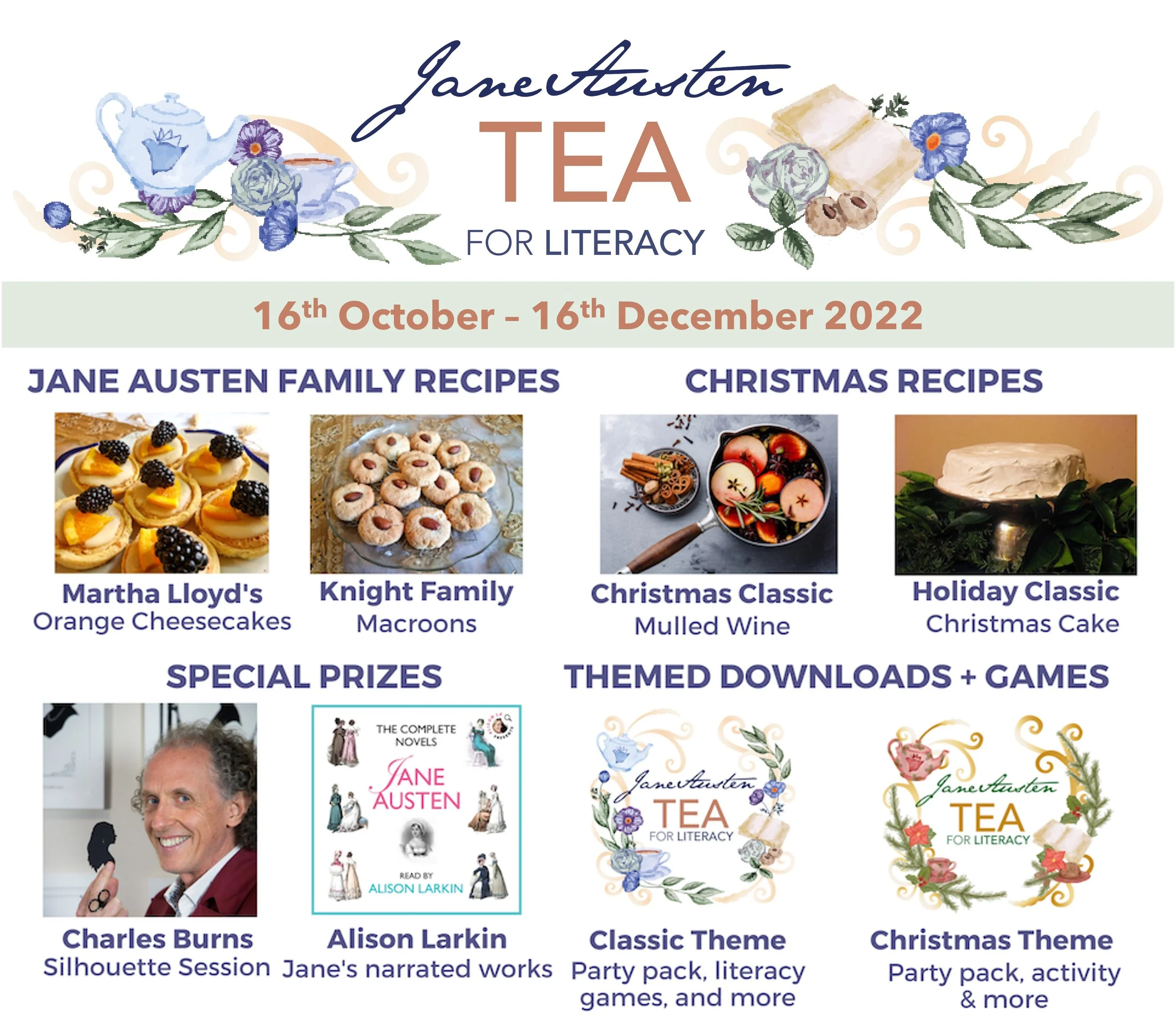 This year’s Jane Austen Tea for Literacy includes a choice of themes – you can use our beautiful classic theme, or our festive theme for parties held later in the year with Christmas recipes and activities.